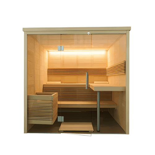 Inneneinrichtung aus Linde: 3 Liegen 62 cm breit, 2 komfortable Rückenlehnen, 2 Kopfstützen, Zwischenbankverkleidung, Ofenschutzgitter, Bodenrost, Saunaleuchte und Leuchtenschirm Holz